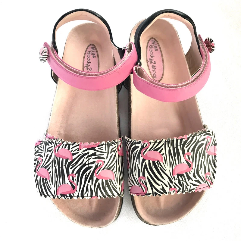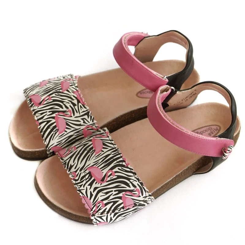 Miss Flamingo is every girls dream sandal, combining pink flamingos and zebra print. Original and unique design by Miss Goody 2 Shoes.